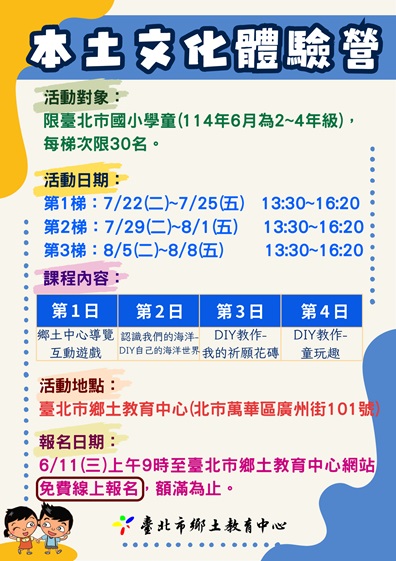 限臺北市公私立國民小學學生,於114年6月底前仍為國小二至四年級的學童參加,每梯限額30名,課程免費參加,活動第一天報到請出示數位學生證,以證明身份別。