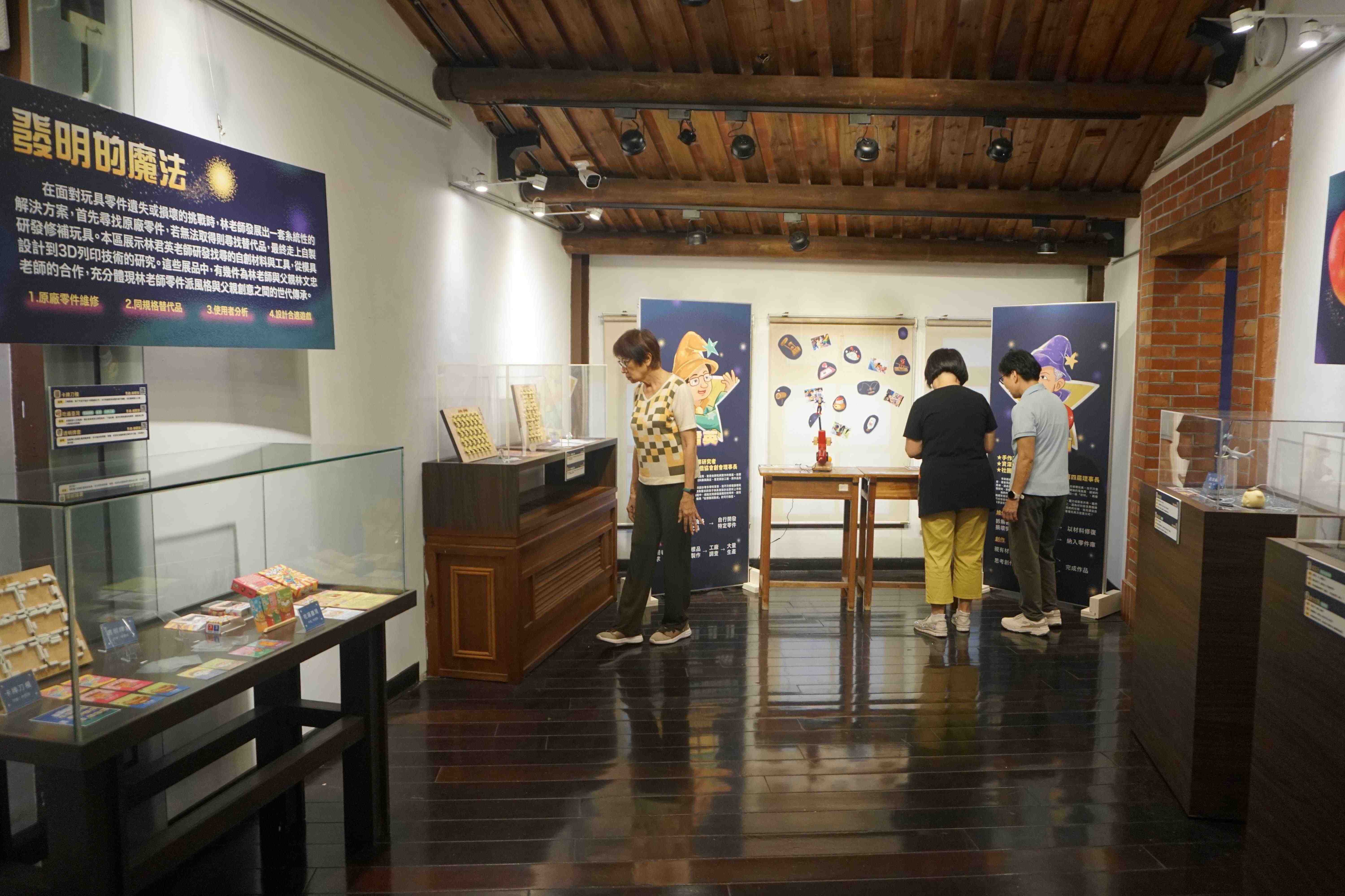 本次展覽魔法師,核心人物李昇兩老師,長年投入玩具修復與再設計,不僅精於物理原理的應用,也能將破損、不耐玩的玩具,轉化為具啟發性與互動性的科學遊戲,他的作品融合材料活用、邏輯思維與創意組裝,極具教育意義,而策展人林君英老師則結合遊戲設計、心理學、幼教與新科技(如 3D 列印、模具設計),了解各種玩具生產的工法與材料,發展出可批量生產、可客製化,或具早期療育與融合友善意涵的遊戲。